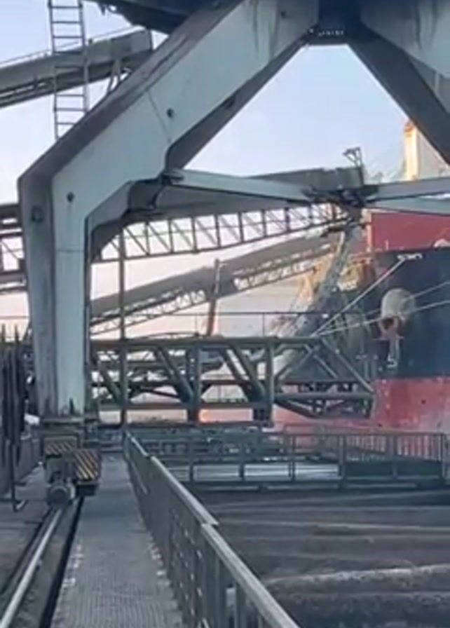 The camera is at a port, looking out past a concrete drainage structure, a large metal structure with a crane, and a ship, towards a body of water and a collection of cranes in the distance on the other side of the water. The ship is visible through the metal structure and is red and black. The sky is blue. There are a few birds in the air.