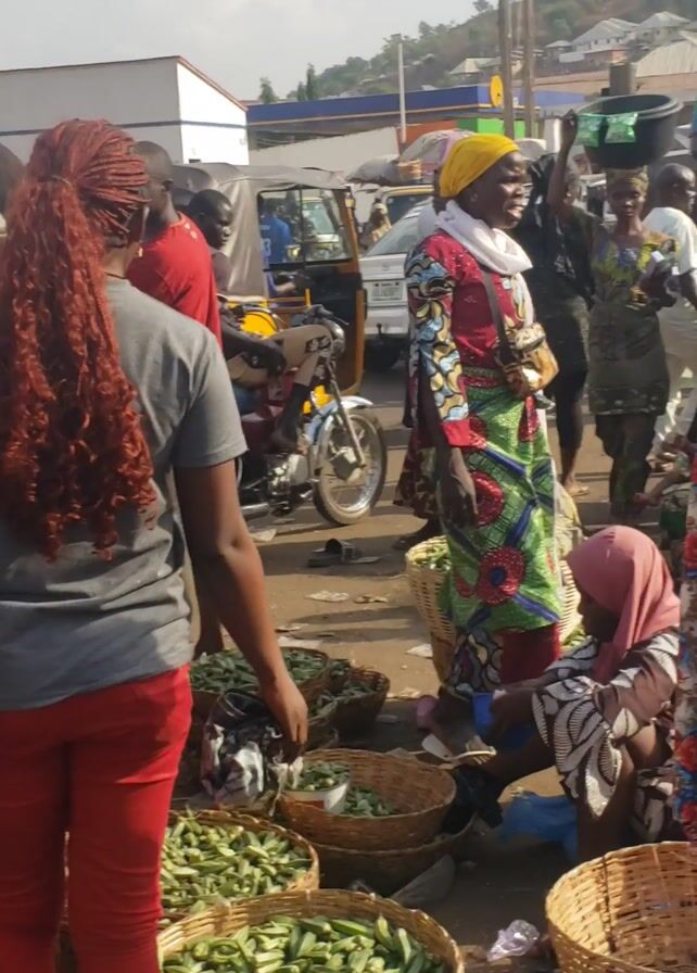 n outdoor market scene. Several people are visible, primarily women. Some are wearing brightly colored clothing and headwraps. One woman is wearing a grey shirt and red pants, and has long red braids. There are baskets full of what appears to be okra. There are also parked vehicles and what looks like a motorcycle taxi. The background shows buildings and greenery. The scene suggests a bustling marketplace environment.