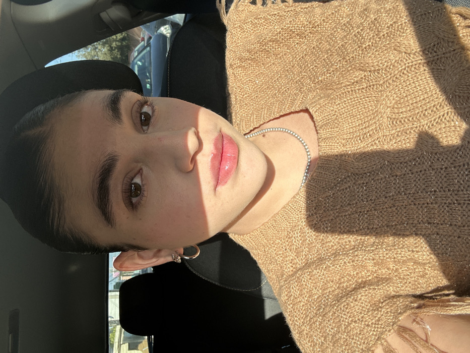 A young woman in a car wears a tan knit sweater and a delicate silver chain necklace. She is turned at an angle towards the camera with her face mostly illuminated by sunlight. She has dark hair pulled back, and her makeup appears minimal with glossy lips and defined eyebrows. She has a silver hoop earring in her left ear. The car interior is visible behind her, including a black seat and other vehicles outside the window.