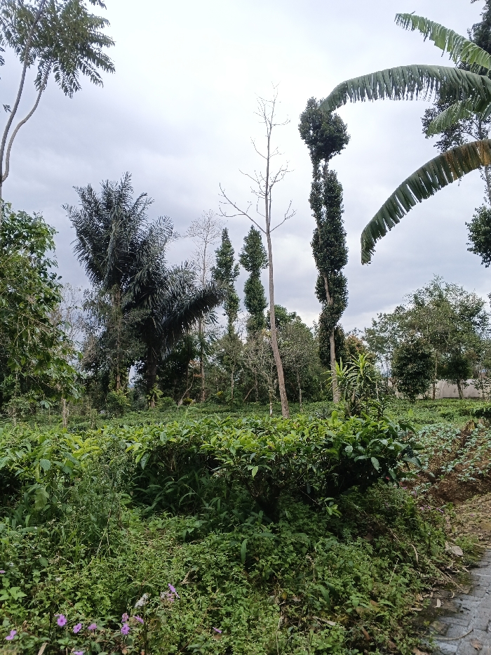 The image displays an outdoor agricultural landscape in the city of Unknown, Vietnam, under an overcast sky. The foreground is dominated by dense green foliage, primarily low-growing leafy bushes consistent with a cultivated tea plantation, interspersed with wild grasses and scattered small purple flowers near the bottom left. A narrow paved edge, possibly a path or road, runs along the bottom right. The midground and background feature a variety of trees, including a large, dark-fronded palm-like tree on the left, several tall and slender coniferous-like trees, a bare deciduous tree with thin branches, and other broadleaf trees. Large, arching banana leaves are visible in the upper right. No individuals or discernible actions are present within the scene.