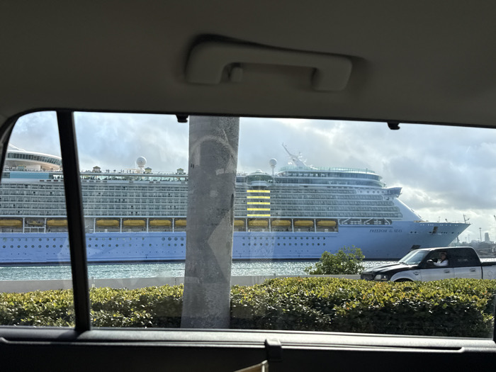 The image captures a view from inside a vehicle, looking out a side window towards PortMiami, United States, visible from a roadway such as the MacArthur Causeway in the vicinity of Miami Beach. The primary subject is the large cruise ship "Freedom of the Seas," identified by its name printed on the hull. The ship, predominantly light blue and white, features multiple decks with numerous balconies and windows, and a prominent line of yellow lifeboats along its midsection. A radar dome is visible on its upper deck structure. The ship is positioned on a body of water, likely a channel or bay, with its bow pointed towards the right. In the immediate foreground, a dark window frame defines the bottom edge of the view. Above this, a line of green, manicured bushes runs horizontally, separating the water from a visible road or path. A thick, dark grey vertical pole partially obscures the left side of the cruise ship. To the right of the pole and above the bushes, a black and white pickup truck, possibly a Ford F-150, is partially visible, moving parallel to the water. A male driver is discernible through the truck's driver-side window. The sky above is partly cloudy, and faint industrial structures, typical of a port, are visible on the distant horizon to the far right. The interior of the viewing vehicle shows a light-colored headliner and a grab handle above the window.