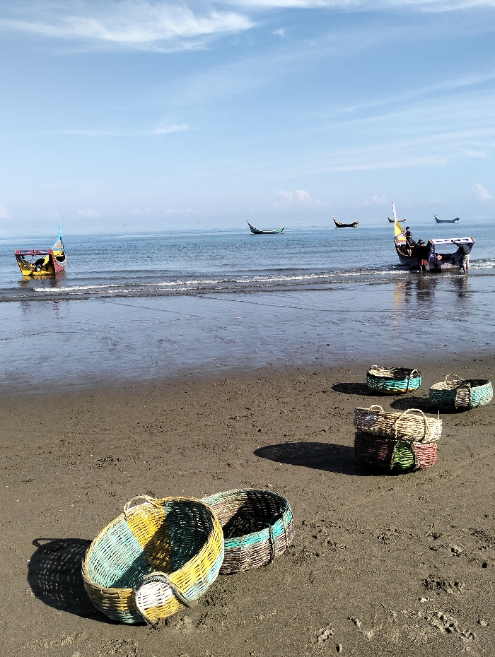 Several colorful fishing baskets sit on a sandy beach. The beach transitions into shallow water, where fishing boats are docked or moving along the shoreline. The sky is blue with scattered clouds. The scene suggests a fishing village where the baskets are used for the day's catch.