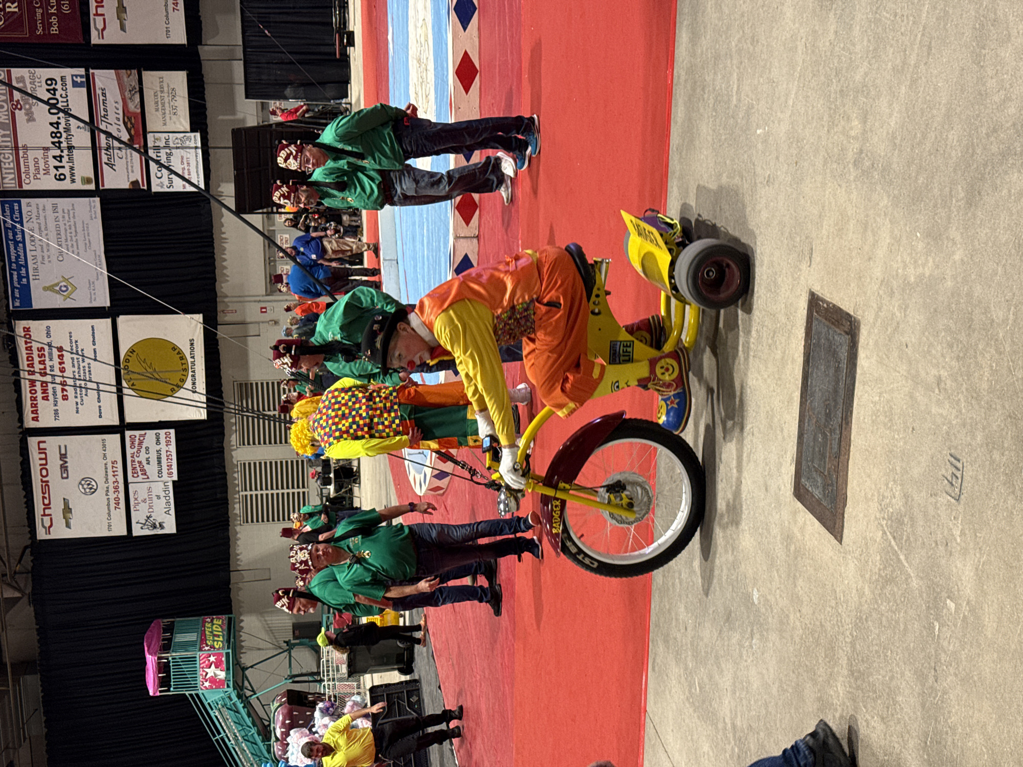An indoor scene within a large venue, likely a convention center or arena, in Columbus, Ohio, USA, depicts a circus-like event. The foreground features a concrete floor transitioning to a wide red carpet that covers the majority of the visible ground. In the immediate foreground, a clown, identifiable by white face paint, a red nose and cheeks, a black hat, a yellow long-sleeved shirt, an orange patterned vest, and orange pants, operates a small, yellow motorized tricycle. The clown wears white gloves and oversized yellow and blue shoes adorned with red details and smiley faces. The tricycle has a red front fender, a white front wheel with "CST BFT" and "Badger" visible on the tire, and two smaller red rear wheels. A label reading "DONATE LIFE" is visible on the tricycle's frame. The clown is positioned facing right, actively riding the tricycle. To the left and behind the clown, a group of men wearing green shirts and distinctive red fezzes with black tassels (characteristic of Shriners) stand on the red carpet. Several of these individuals are looking towards the clown or the center of the event. One man in a bright yellow shirt and black pants walks away on the far left, near the base of a tall, teal-colored carnival slide structure labeled "SUPER SLIDE" with a pink upper section. Adjacent to the slide are large, red, strawberry-shaped inflatable or soft objects. In the mid-ground, a circular circus ring with red, white, and blue patterned borders is visible on the red carpet. More individuals, including several more men in green shirts and fezzes, are scattered throughout the background, some standing near the ring, others moving. The far background consists of large black drapes, behind which numerous commercial banners are displayed. Identifiable banners include "Chesrown GMC," "Aarrow Radiator," "Integrity Moving & Storage LLC," "Hiram Lodge No. 18 Free and Accepted Masons," "Central Ohio Labor Council AFL CIO," "Pipes & Drums of Aladdin," and "Anthony-Thomas Chocolates." These banners frequently list "Columbus, Ohio" as a location or service area, confirming the city. Overhead, various rigging cables extend across the scene, and fluorescent lights are visible in the distance.