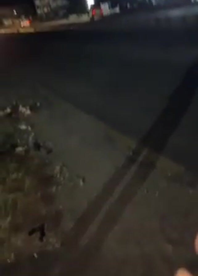 The video is recorded at night, possibly by a person standing on the side of a road