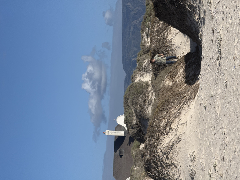 A person stands in a sandy gully. Vegetation climbs the sandy walls. To the left, a building with a chimney and satellite dish sits atop the sandy ground. The sky is blue with a large cloud formation. Distant mountains are seen through a hazy sky. The scene appears to be on a sandy beach.