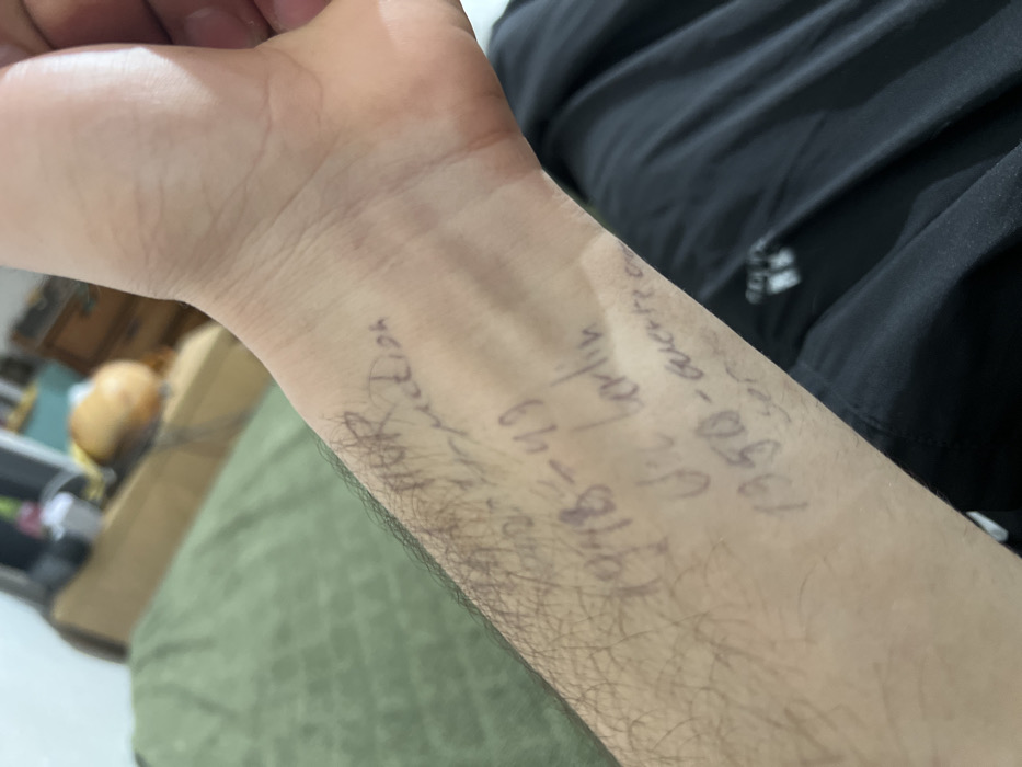 - "On a fair-skinned arm, handwritten notes in faint black ink are visible" by FM-uZazy2, licensed under CC BY 4.0