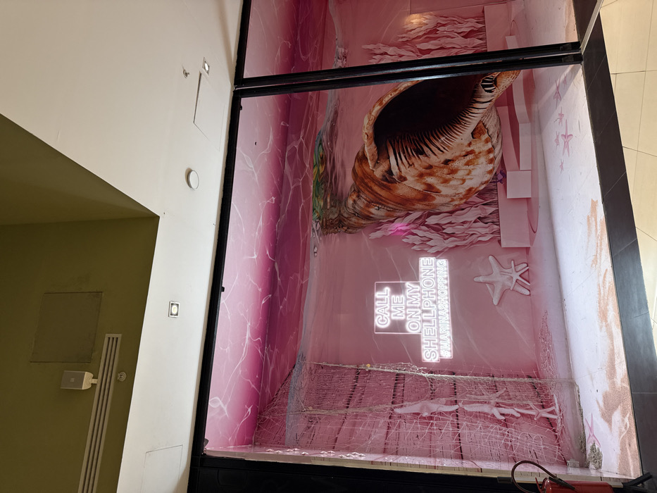The image depicts a static retail display window within the Marina Shopping mall in Casablanca, Morocco. The display presents an immersive, predominantly pink underwater-themed scene. The foreground shows a dark tiled floor of the mall, with a red fire extinguisher partially visible on the far left. A black-framed glass partition separates the mall interior from the display. Above the display, a white ceiling features recessed lighting. An olive-green upper wall section contains a rectangular air vent, a white wall-mounted device, and a circular smoke detector. Within the display, the walls and ceiling are covered in a pink design simulating rippling water, while the floor is pink, textured to resemble sand, with faint starfish outlines and scattered pink granular material. A large, brown and white textured conch shell, appearing realistic, is positioned prominently on the right side, extending towards the background. To the left of the conch shell, a white neon sign illuminates the text "CALL ME ON MY SHELLPHONE" above "#MARINASHOPPING". On the left side of the display, a white fishing net hangs vertically, adorned with several white starfish forms. A larger, standalone white starfish figure rests on the pink floor towards the center-left. Stylized white or light pink coral-like structures are arranged towards the right, behind the neon sign. No individuals are present in the scene.