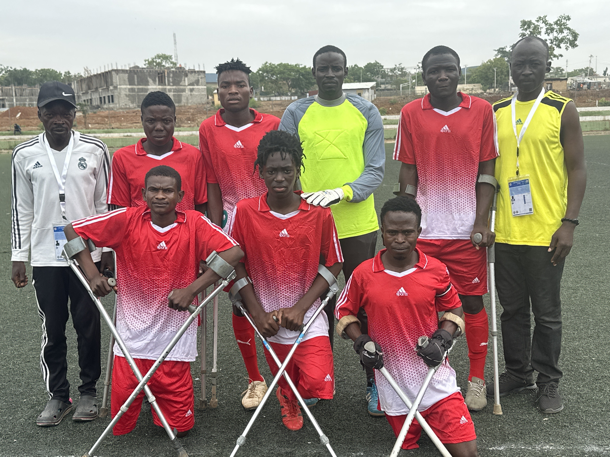 On a green field, a group of nine men are posing for a picture in the city of Unknown, Unknown. Seven of the men are wearing red and white soccer jerseys and red shorts. They all have crutches and are amputees. The man in the center back is wearing a grey and green long sleeve shirt with white gloves. The man on the far left is wearing black pants and a white Adidas jacket with a lanyard. The man on the far right is wearing black pants and a yellow shirt with a lanyard. In the background is a building under construction and various trees. The sky is overcast.