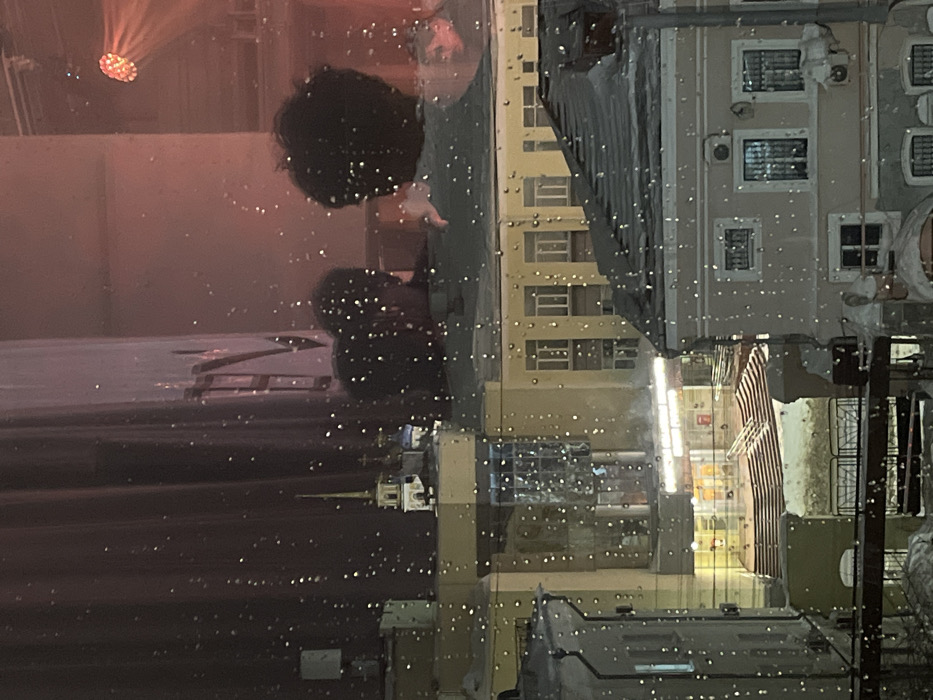 Reflections in a rain-streaked window show a person with dark, curly hair silhouetted against a blurred, warm-toned interior with stage lighting. Alongside the person, a densely packed urban scene is mirrored. Buildings with numerous windows are prominent, interspersed with narrow passageways illuminated by bright, white light. Small droplets obscure the details of the mirrored image.