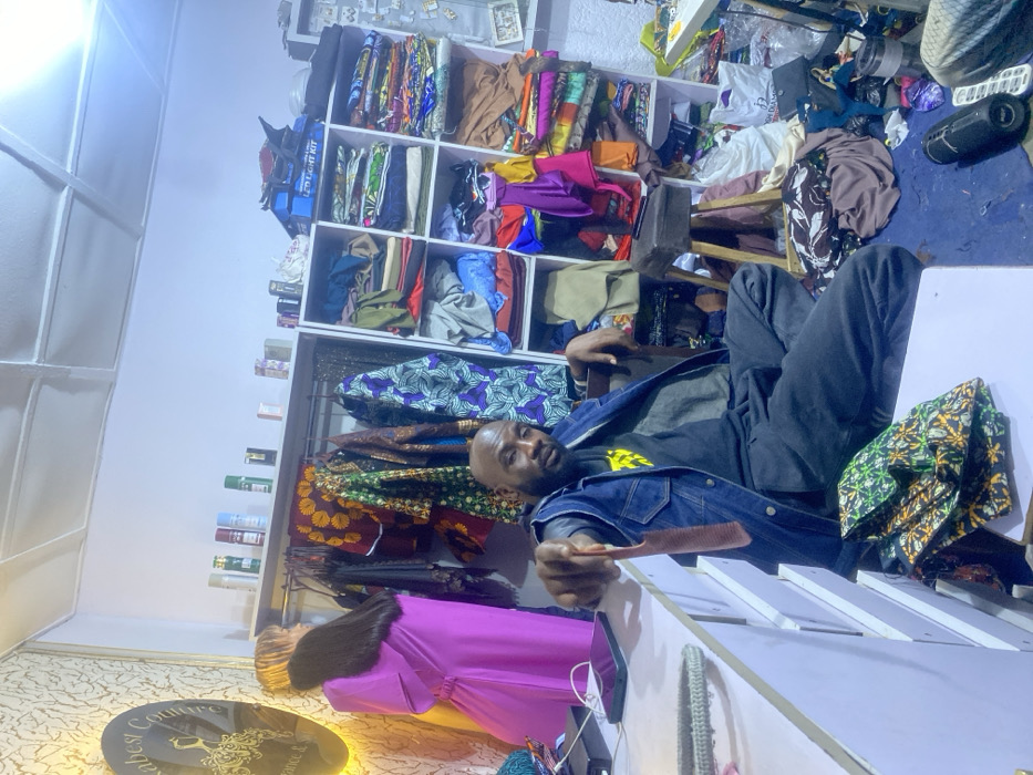 A man with dark hair and a denim jacket reclines in a cluttered fabric shop