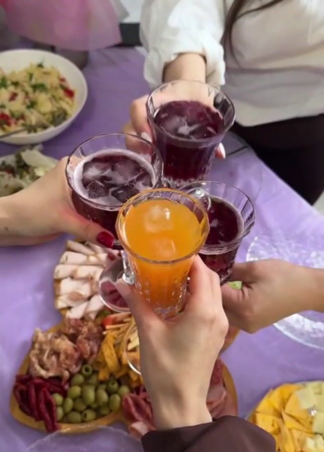 Four people are gathered around a table covered with a light purple tablecloth, making a toast with their drinks. Three of the drinks are a deep red color, and one is orange. All of the drinks contain ice cubes. There is a wooden platter on the table containing various food items, including meat, olives, and crackers. Other plates on the table hold salad and cheese. One person is wearing a white shirt, and another is wearing a brown jacket. They are all holding glasses up, presumably celebrating a birthday. The audio confirms it is a birthday celebration.