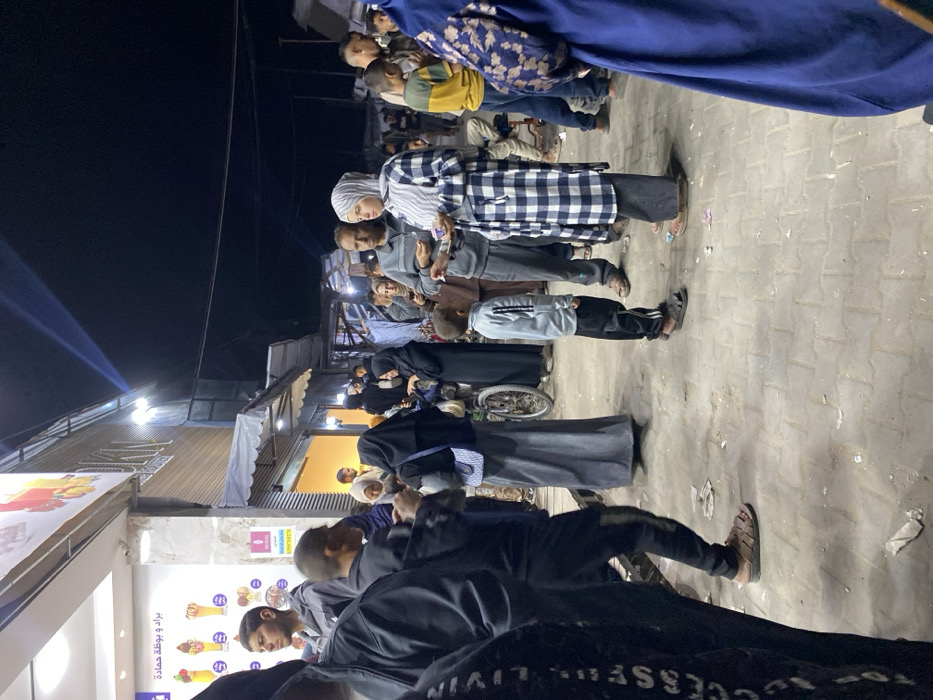 People stand in a line at night outside a storefront. The queue contains adults and children. A woman in a checkered coat and headscarf stands near the front. Others wear traditional Muslim clothing. A store with colorful ice cream pictures sits to the side of the line. Street lights illuminate the scene. The sky is dark above.