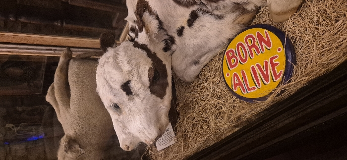 The image displays a static indoor exhibit, likely within a museum or curio establishment, in Austin, Texas, United States of America, consistent with the Museum of the Weird on 6th Street. In the foreground, a taxidermied calf, white with distinct brown patches around its eyes and body, rests on a bed of dry hay. Its head is turned towards the left of the frame. A small white label or tag is partially visible on the hay near the calf's head. To the lower right, a circular yellow sign with a blue border is placed on the hay. The sign features the words "BORN ALIVE" in prominent red capital letters with yellow outlining. Partially visible in the background, behind the calf, is another taxidermied animal, resembling a light-colored lamb or small sheep, also positioned on hay. The display appears to be enclosed within a glass case, with a dark wooden frame visible on the right side. The background is dark and indistinct, showing reflections and shadowy interior elements, including a faint blue light source in the upper left. No living persons or animals are depicted.