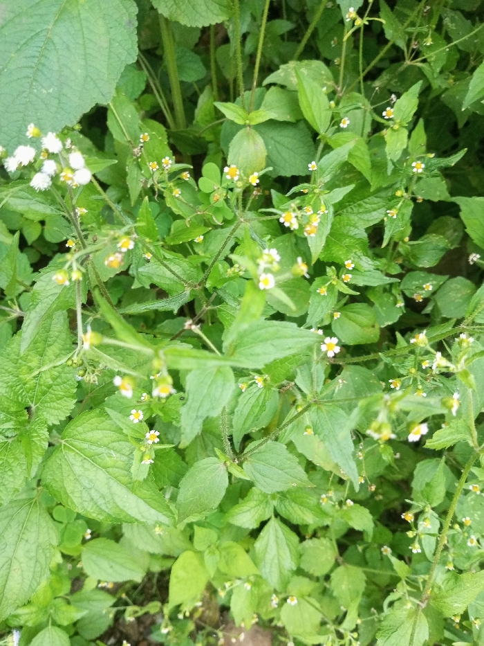 The scene is a close-up view of dense, uncultivated vegetation in the city of Tecuci, Romania. The image primarily features green herbaceous plants with ovate to lanceolate leaves, many exhibiting serrated margins. Numerous small, approximately 0.5 to 1 cm diameter, flowers are interspersed throughout the foliage. These flowers predominantly display white ray florets surrounding yellow disc florets. Smaller yellow blossoms are also present. The plant stems are slender and green. No human subjects, animals, or artificial structures are discernible. The ground beneath the plant growth is entirely obscured by the dense vegetation.