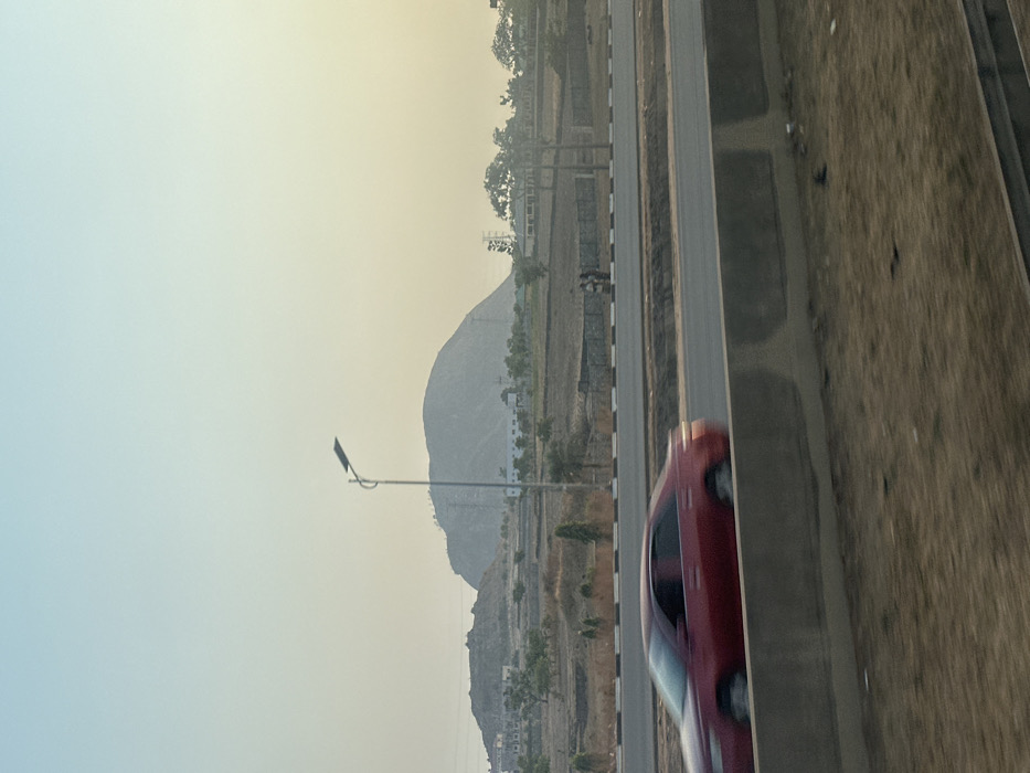 The image displays an outdoor scene in Gosa, Nigeria, under a hazy, pale blue to yellow sky. In the foreground, a blurry, brownish-green ground surface precedes a light grey concrete barrier. Beyond the barrier, a multi-lane asphalt road extends horizontally. A red sedan, exhibiting significant motion blur, is positioned on the road, indicating movement from left to right. The road is demarcated by a white and black striped curb. The mid-ground features dry, light-brown terrain with sparse vegetation and scattered deciduous trees. A grey concrete block wall runs parallel to the road. A tall, dark grey street light pole, topped with a flat, dark solar panel, stands centrally. In the distance, multiple low-rise structures, including a longer white building, are visible, along with several power transmission pylons. Two indistinct human figures are observed standing or walking on the far side of the road, to the right of the street light pole. The background is dominated by a large, rounded, grey-blue rock formation or hill, flanked by smaller, jagged rocky outcrops to its left. The horizon line is indistinct due to atmospheric haze.
