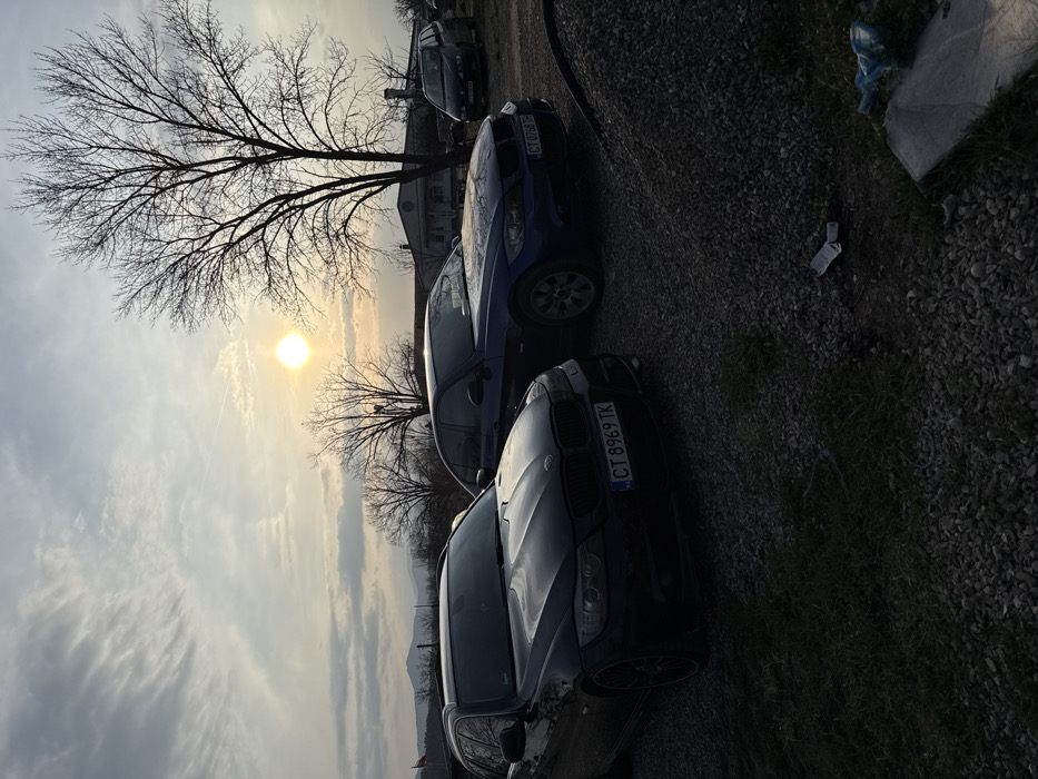 The scene depicts an outdoor environment in Gorno Cherkovishte, Bulgaria, under a cloudy late afternoon or early evening sky with the sun low on the horizon, casting strong backlight. Two parked BMW E9x series vehicles dominate the midground: a black E91 touring (wagon) with license plate CT 8969 TK is positioned to the left, and a dark blue E90 sedan with license plate CT 0768 TH is to its right and slightly behind. A third, dark-colored hatchback or small SUV is partially visible in the far right background. The vehicles are parked on a gravel surface interspersed with patches of dry grass. A pile of gravel is visible in the lower right foreground, along with miscellaneous debris including a crumpled white object and a blue plastic bag. Bare deciduous trees, indicating late autumn or early spring, are prominent throughout the background, with a large, central tree silhouetted against the bright sky. In the far background, a light-colored building with a dark roof is visible, along with distant low mountains or hills on the horizon. No individuals are present, and no active interactions are depicted.
