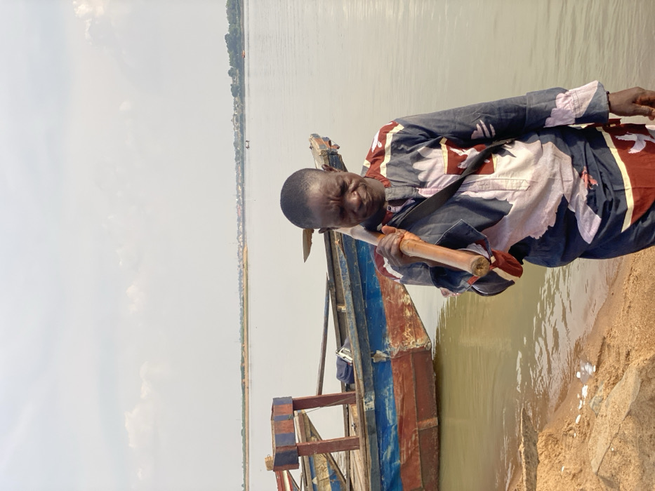 A sole individual stands on the sandy bank of the River Benue in Makurdi, Nigeria. The dark-skinned man, with short dark hair, is positioned front-center, looking downward with a somber expression. He is dressed in a long-sleeved, collared tunic featuring a dark blue base adorned with irregular patterns in light purple and maroon. A light-colored wooden pole rests on his right shoulder, gripped by his right hand, and a dark strap crosses his chest from left to right. To his left, partially submerged in the brownish-green river water, is the stern section of a weathered wooden boat, painted primarily blue and red with peeling paint. A dark bag is visible inside the boat. The calm river extends into the background, where a distant, vegetated shoreline with faint buildings is visible under a light grey, cloudy sky. Small white fragments are scattered on the sand in the immediate foreground to the left.