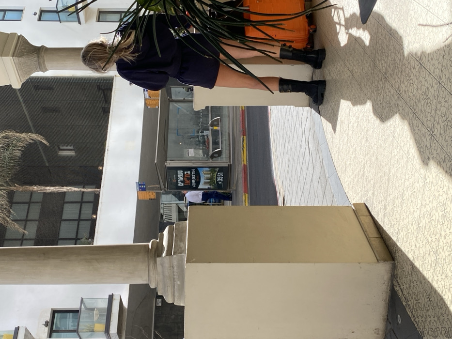 The image depicts an urban street scene in Tel Aviv-Jaffa, Israel, viewed from beneath an architectural overhang. In the foreground, positioned to the right, a person with blonde hair in a ponytail, wearing a dark blue tracksuit (hoodie and shorts) and black combat boots, stands with their back to the viewer. An orange hardshell rolling suitcase is situated to their right. Partial shadows from unseen overhead structures and foliage are cast across the light-colored, patterned tiled floor where the person stands. To the left, a large, light-colored square pillar and a classical fluted column base define the foreground architectural elements. Beyond these, across an asphalt road with red and yellow painted curbs, a man in a white collared shirt and dark trousers stands near a glass bus stop shelter. The bus stop features advertisements in Hebrew, including text translating to "Remaining in Tel Aviv" and an image of apartment buildings, with a phone number *3551 visible. In the background, multiple multi-story buildings are visible; one features dark, grid-patterned windows, and another is white with balconies. A palm tree rises above the white building. The sky is partially cloudy.