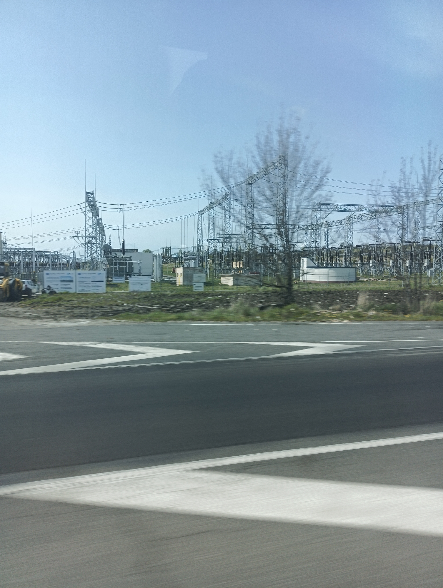 The image, apparently taken from a moving vehicle, shows an electrical substation located adjacent to a road
