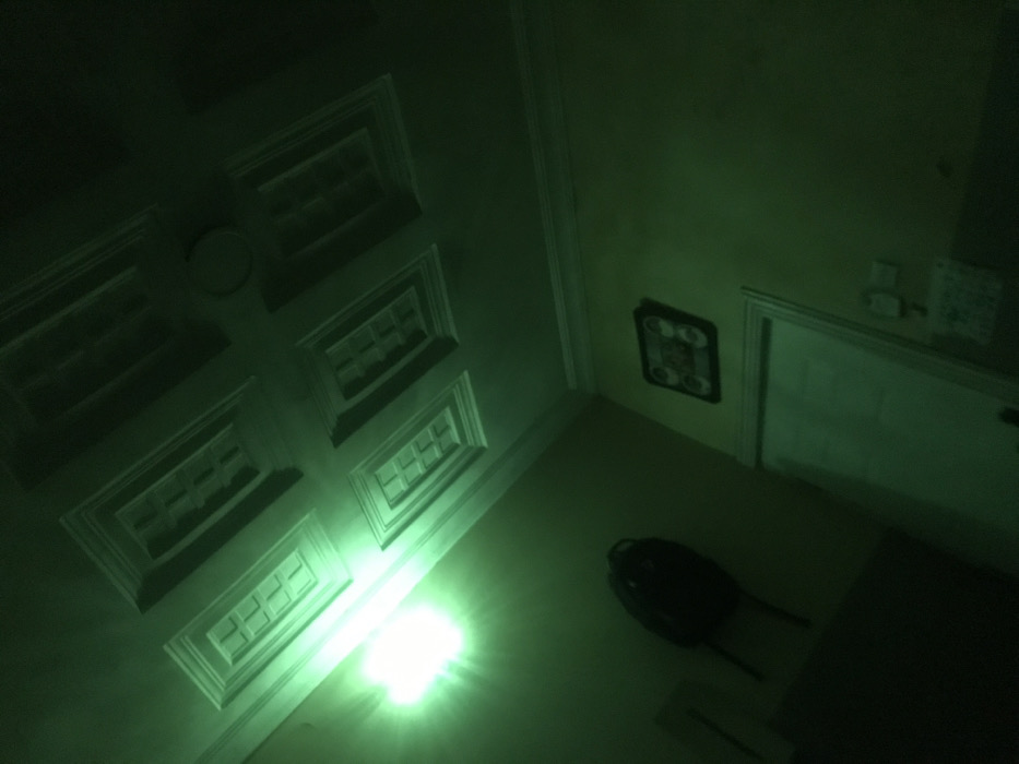 A dimly lit room, bathed in green light. Intricate ceiling details are visible. On one wall, a framed picture hangs above a closed door. A dark object, possibly a backpack, rests on the floor near a partially visible table. The scene is sparse and has a slightly eerie atmosphere.