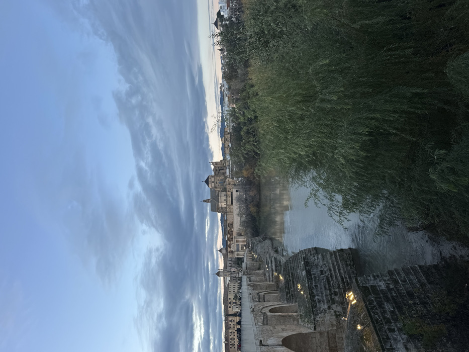 An image shows a city skyline along a river, taken from a high angle. Buildings are visible on the left, including the Mezquita-Cathedral of Córdoba, Spain. In the foreground, a stone bridge spans the river. A dense willow tree is prominent on the right, partially obscuring the riverbank. The sky features a mix of blue and gray clouds, suggesting either dawn or dusk.