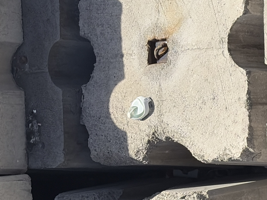 The image depicts a close-up, high-angle view of a section of a concrete structure in Câmara de Lobos, Portugal, under bright daylight. A small, light-colored plastic object, appearing to be a bottle cap or a small cup containing clear liquid, rests on the rough, light-gray surface of a large, interlocking concrete block. To the right of this object, a heavily corroded, reddish-brown metal fixture, possibly a U-bolt or anchor, is embedded within a square recess in the concrete block, surrounded by significant rust staining. The concrete blocks feature distinctive "keyhole" or "bone-like" interlocking shapes and exhibit a coarse texture with areas of darker discoloration and shadows, particularly within crevices and the indentations of the blocks. A deep, narrow vertical gap separates two concrete blocks on the left side of the frame, revealing dark shadows within. No individuals, actions, or interactions are present in the scene.