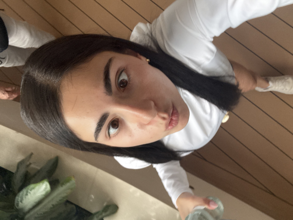 - "A high-angle photograph captures a young female looking directly upwards at the camera, exhibiting a cross-eyed gaze and pursed lips" by FM-6WaBe2, licensed under CC BY 4.0
