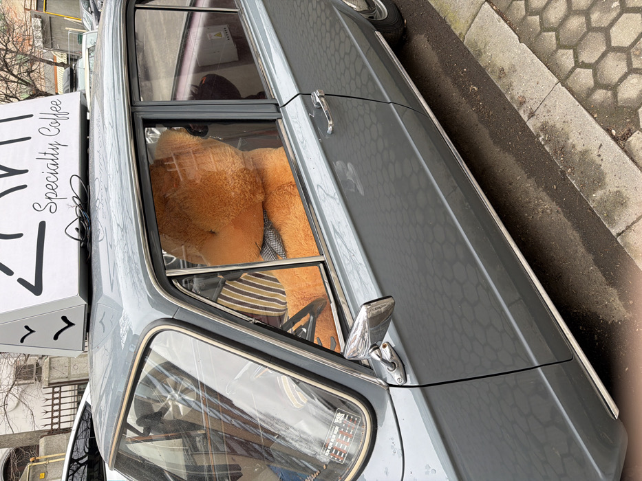 A light grey, vintage-style sedan is depicted parked on a paved surface next to a curb in Bucharest, Romania. A very large, orange-brown teddy bear, wearing a grey and white checkered bow tie, is positioned in the driver's seat, its upper torso and head visible through the front windshield and driver's side window. A white, trapezoidal sign, displaying "Specialty Coffee" and additional graphic elements in black text, is affixed to the car's roof, with a tangled black wire resting upon it. The vehicle features chrome trim around the windows, door handles, and a side mirror. The ground adjacent to the car consists of hexagonal patterned pavers and a narrow strip of dirt. In the background, other vehicles, a metal fence, and bare-branched trees are partially visible under overcast lighting conditions. No human subjects are present in the image.
