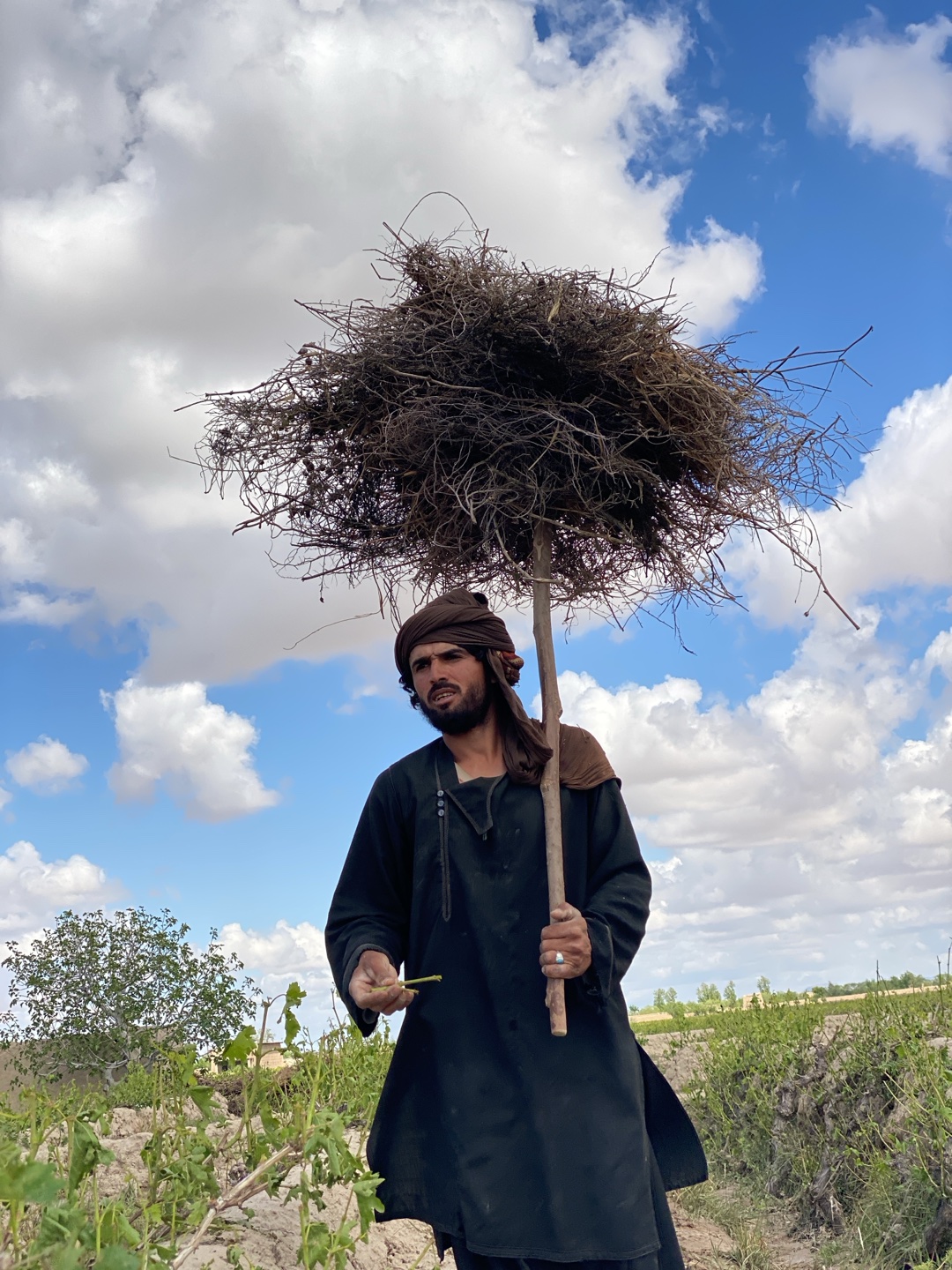 A man stands in a field in Qazi Kariz, Afghanistan. He wears a dark robe and a turban, holding a stick topped with a large, tangled mass of dry branches. He holds a small green sprig in his left hand. The field contains rows of low-lying plants and a small tree is visible in the background. The sky is blue with scattered white clouds.