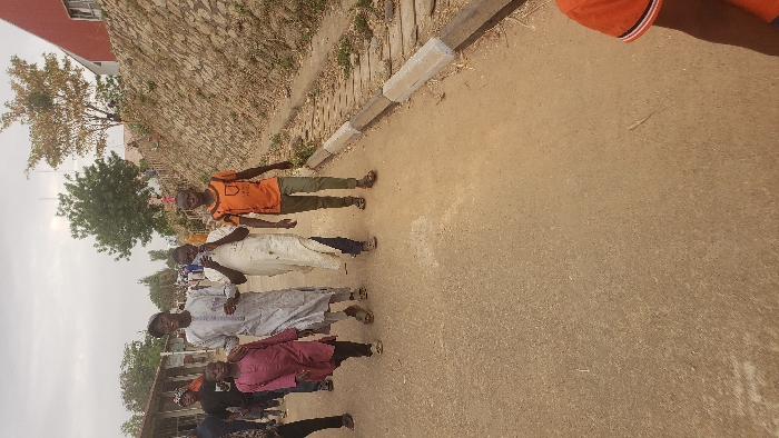A group of people, including one child wearing an orange shirt, walk along a paved road. A stone wall borders one side of the road, with a curb marked by white blocks. The other side of the road features trees and a glimpse of buildings in the distance. The sky is overcast. The road occupies most of the image's right side. The image appears rotated.