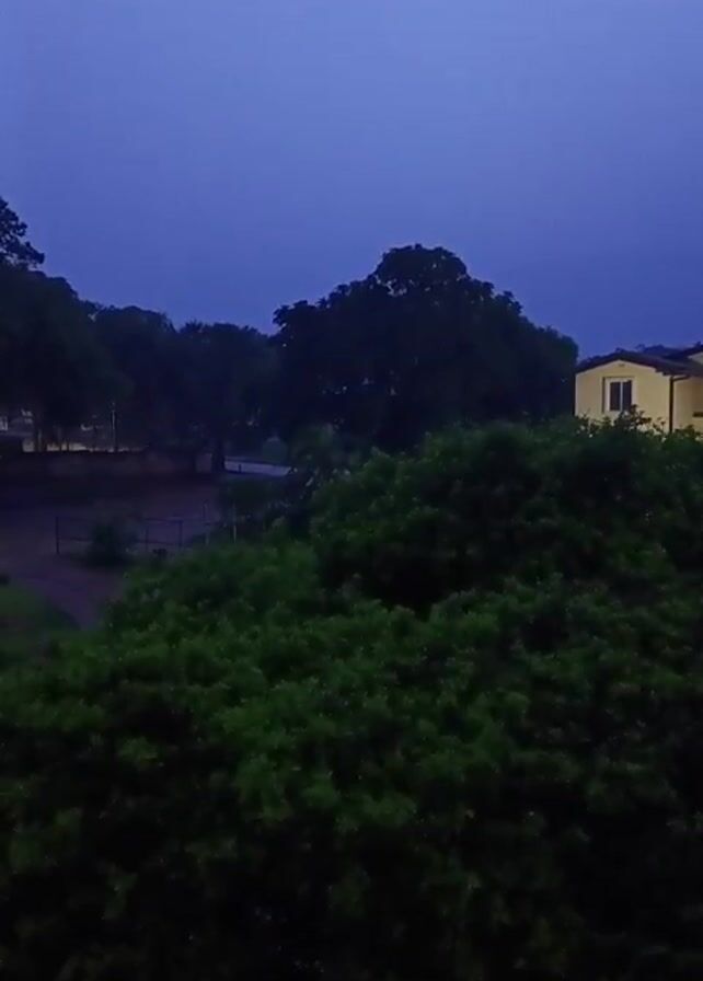 landscape at dusk or dawn, under a dark blue sky. The foreground is filled with dense, green bushes. Behind the bushes, there's a somewhat clear path leading to a cluster of trees in the middle ground. To the right, a single-story, light-colored building with a visible window stands among the trees. The overall scene is dimly lit, with the sky suggesting an overcast or stormy weather. The trees and bushes are motionless, indicating calm conditions.