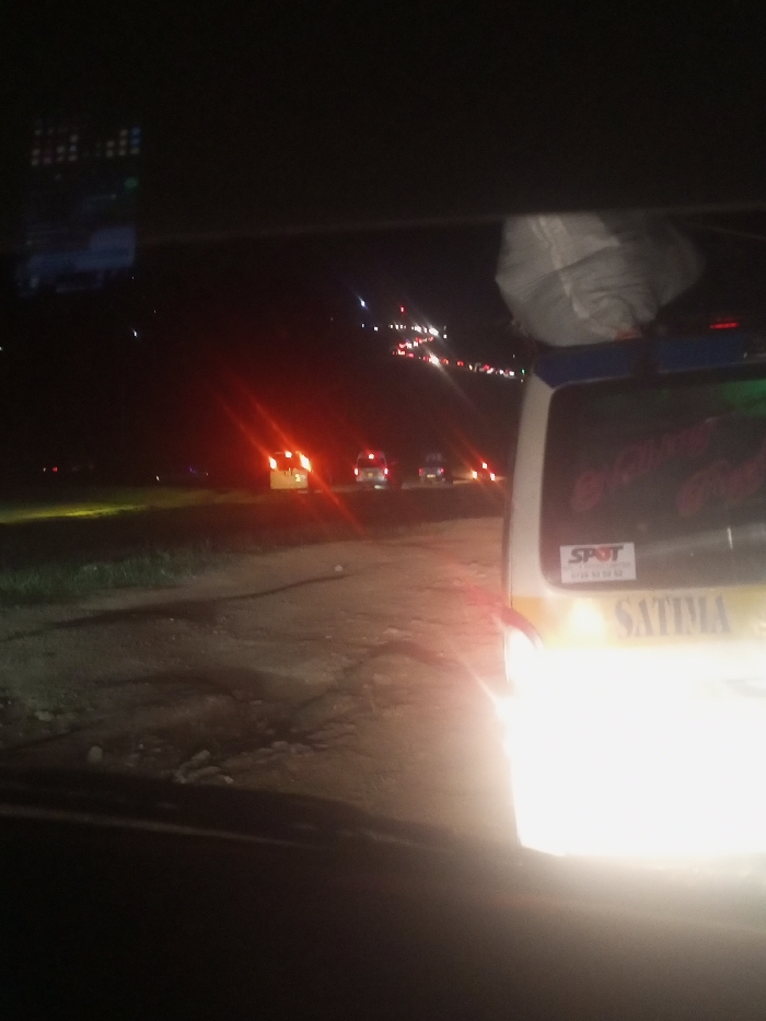 A night-time image depicts a vehicle with illuminated taillights and headlights, parked on a dimly lit road. Other vehicles with tail lights are visible in the distance, suggesting traffic. "SATIMA" is written prominently on the side of the parked vehicle. A sticker that reads "SPOT" is also visible. The road appears to be cracked or damaged in the foreground, and there is some grass visible on the side of the road.