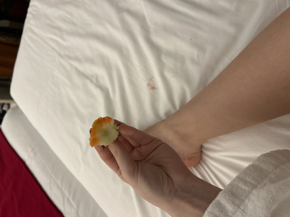 A hand holds a partially eaten slice of fruit, possibly strawberry, with white flesh and reddish outer layer. The backdrop is a wrinkled white bedsheet with a few small red stains. A leg and foot rest on the sheet next to the hand. The person is wearing a white, terrycloth robe, as the edge of a sleeve is visible in the lower right corner.