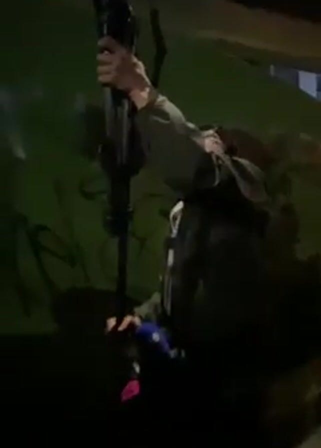 The video starts with a person in a green jacket holding a camera tripod and gear with an AFP microphone. The camera then pans up to show a large crowd of people at night. Many people are holding and waving Bolivian flags, and there are people on a structure above the crowd. The people are chanting in Spanish. Buildings are visible in the background.
