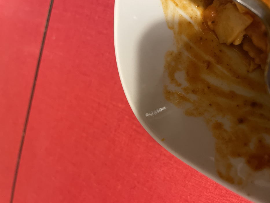 A close-up depicts a partially eaten meal on a white plate, with remnants of food and sauce smeared across its surface. The plate is placed on a red surface. A utensil is partially visible, suggesting recent use. The image focuses on the immediate aftermath of dining.