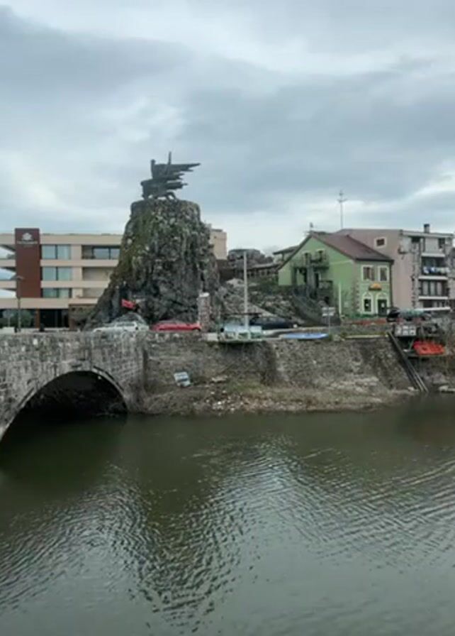 river with a stone bridge on a cloudy day. On the side of the bridge is a rocky island with a sculpture of a bird-like creature on top. Several buildings are visible on the opposite shore, including a modern hotel and a green house. The water is calm with visible ripples. The surrounding area has some signs of construction and debris.