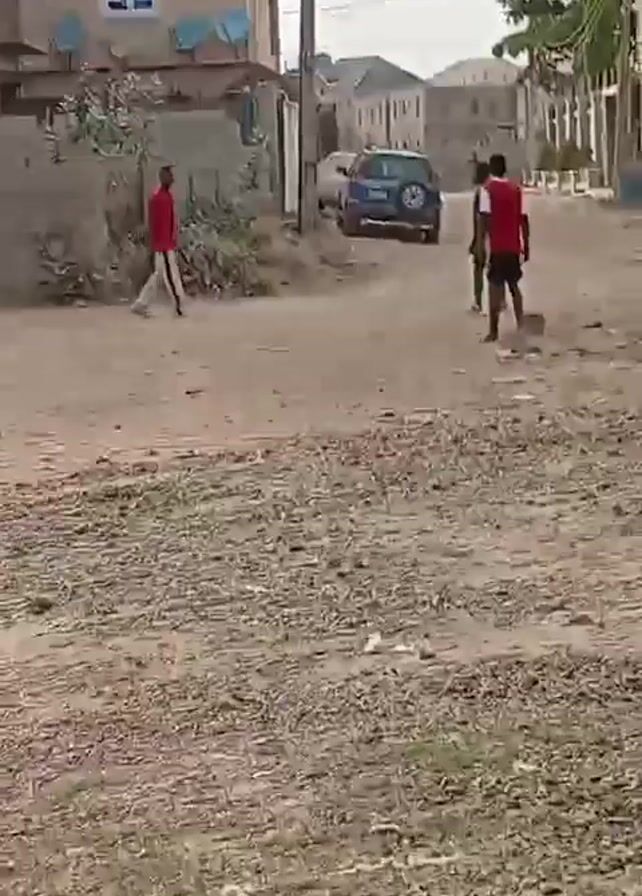 The video depicts a sandy, open area in what appears to be a residential neighborhood. There are several people, mostly young men, present in the video. Some are standing, some are sitting on a low brick wall, and others are walking. The people are wearing casual clothing. The environment consists of low-rise buildings, some of which have satellite dishes on them. A car passes by on what seems to be a dirt road. The ground is uneven, covered with sand and some sparse vegetation. The overall impression is of a casual, unpaved area where people are gathering or playing.