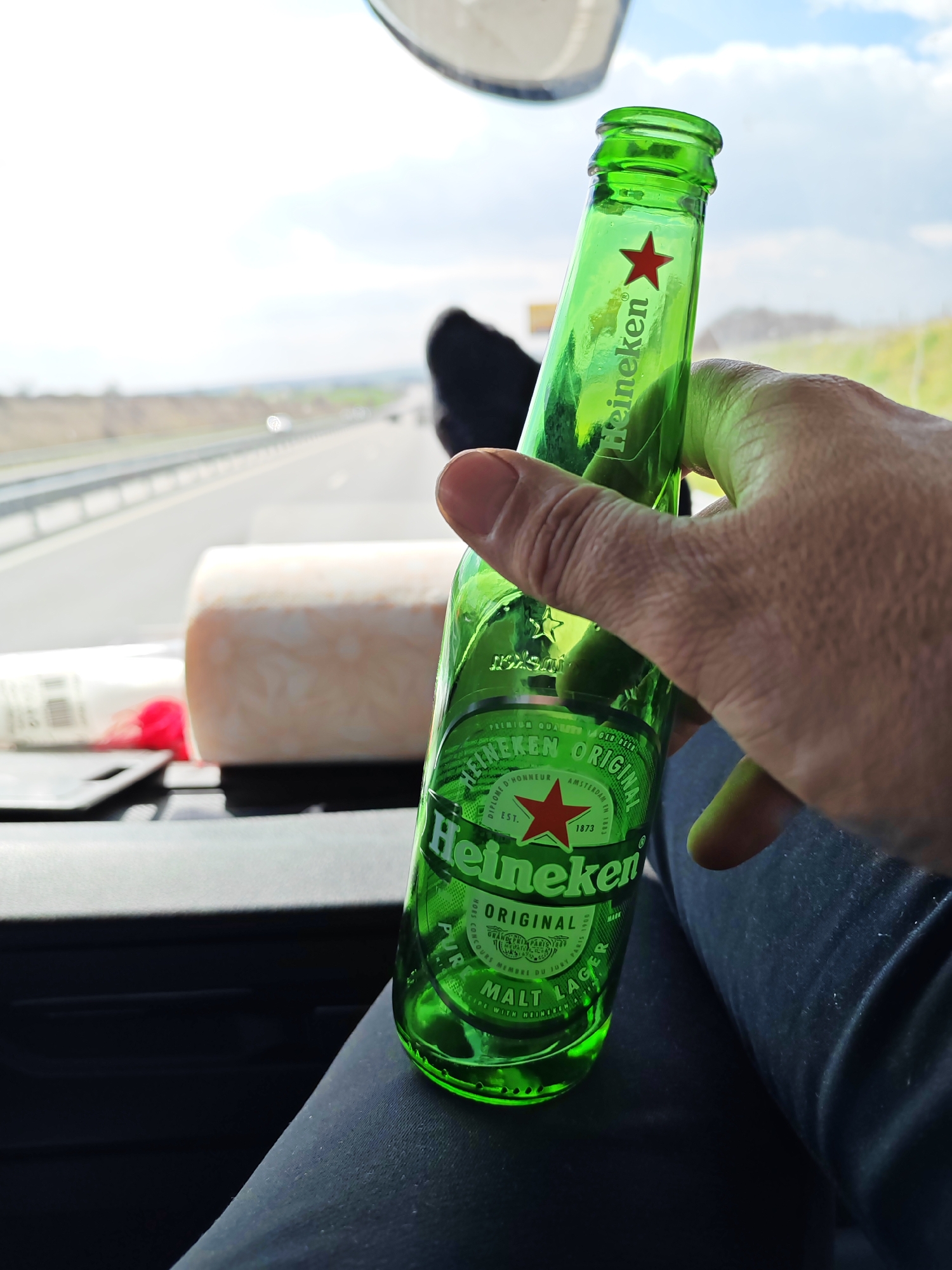 The image depicts a close-up, first-person perspective from within a vehicle, looking out towards a highway. A human right hand, appearing to be that of an adult, is visible in the foreground, holding an empty green glass Heineken beer bottle. The bottle's label, featuring "Heineken Original Lager" and the red star logo, is clearly legible. The hand and bottle rest partially on a leg, which is clothed in dark-colored trousers. In the mid-ground, a dark dashboard or interior surface is visible within the vehicle. On this surface, a white cylindrical object, possibly a roll of paper, and other indistinct items are present. The background, seen through the vehicle's windshield, shows a multi-lane highway stretching into the distance under a partially cloudy sky. Several blurred vehicles are observable on the highway, indicating traffic. Metal guardrails line the road. Beyond the highway, a landscape of brown earth and green vegetation is visible. The scene is situated on a highway within or near the city of Yazdach, Bulgaria.