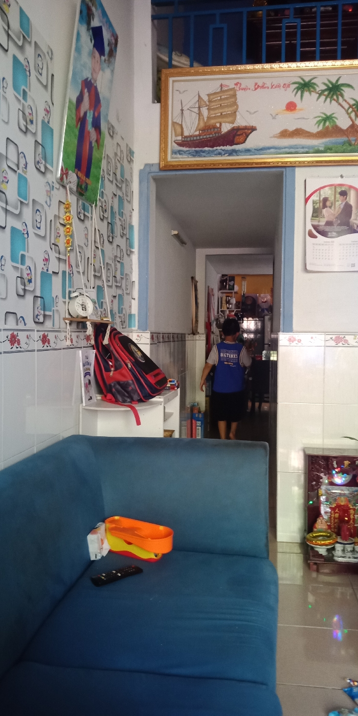 interior of a home in Dĩ An, Vietnam, located at the coordinates 10.902 latitude and 106.785 longitude. The home has white walls and a tiled floor. A blue couch is in the foreground. There is a remote control and a small orange and yellow toy on the couch. In the background, a small shrine is on the right. It has a glass top and is filled with various trinkets and statues. There are several books on a shelf. A young boy, wearing a blue shirt and black shorts, is walking away from the camera down a hallway. A backpack sits on a shelf on the left side of the hallway. On the wall, above the backpack, a framed picture is hanging. Another framed picture hangs above the shrine. It depicts a sailing ship. The image is taken from a low angle.
