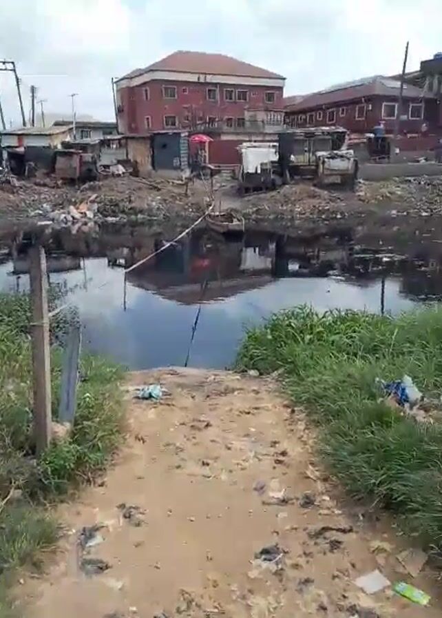 body of water filled with trash, with buildings visible in the background. The water is dark and reflects the buildings. A rope is stretched across the water. The ground leading to the water is muddy and littered with trash. Green vegetation grows on either side of the muddy path. There are no people visible in the video.