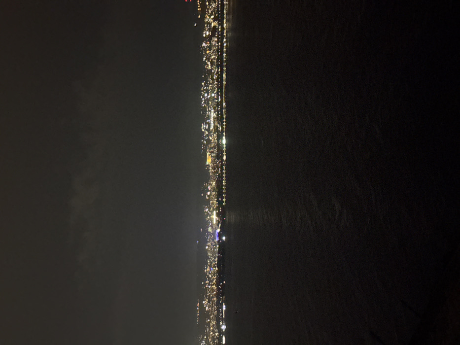 The scene presents a panoramic, nocturnal view of the city of Varna, Bulgaria, observed across a substantial body of water, likely the Black Sea or Varna Lake. The upper third of the image displays a dark, uniformly overcast sky, devoid of celestial bodies. The mid-ground is dominated by the distant city skyline, appearing as a horizontal band of numerous artificial lights, predominantly yellow and white, spanning the visible horizon. A distinct cluster of brighter, possibly blue or white, illumination is discernible towards the center-left of the illuminated cityscape. On the far right periphery of the city lights, a tall structure exhibits red warning lights. The lower two-thirds of the image comprises the dark, calm water surface, reflecting only faint ambient light from the distant urban area. No human subjects, specific actions, or identifiable vessels are present within the frame.