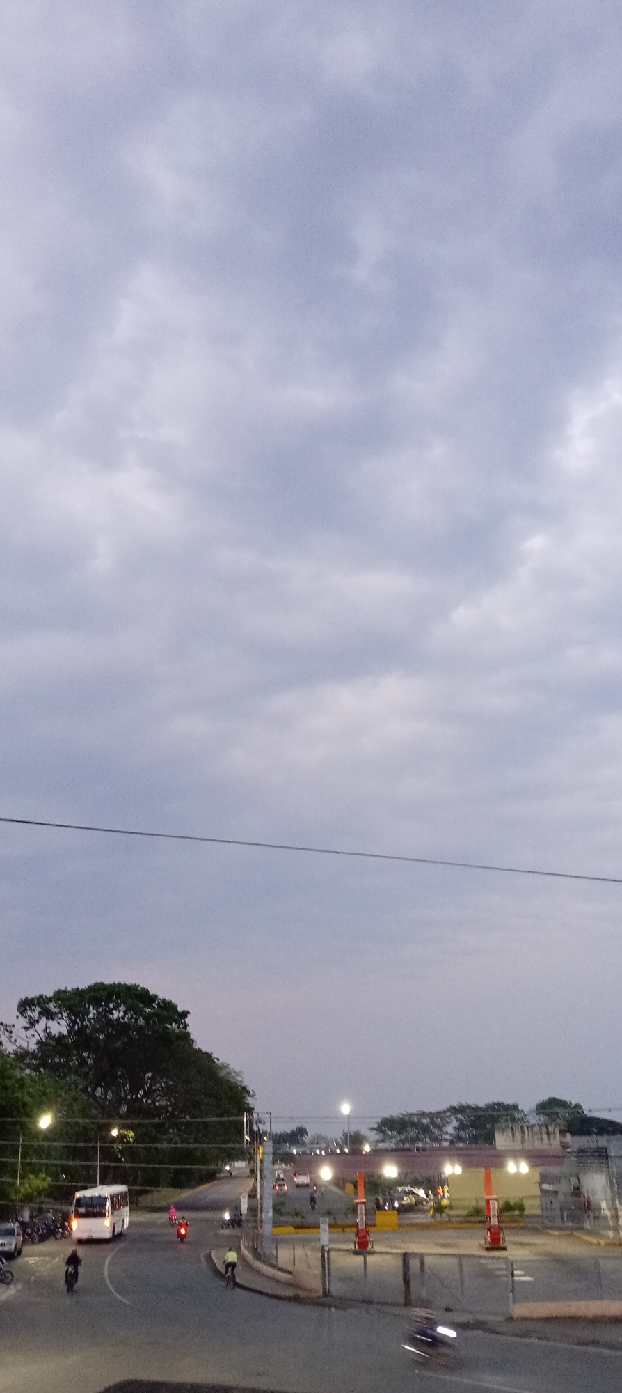 street scene in Tinaquillo, Venezuela, taken at dusk or dawn. The sky is overcast with grey clouds. A thin horizontal cable stretches across the middle ground. In the lower left, there is a cluster of trees and streetlights. A white minibus is visible on the road along with several motorcycles and a cyclist. In the right foreground is a gas station with red and white pumps under a canopy lit by artificial lights. Cars are parked near the gas station. A fence borders the sidewalk along the road. A few other cars can be seen on the street in the background. The scene shows a typical urban street at a time when natural light is low.