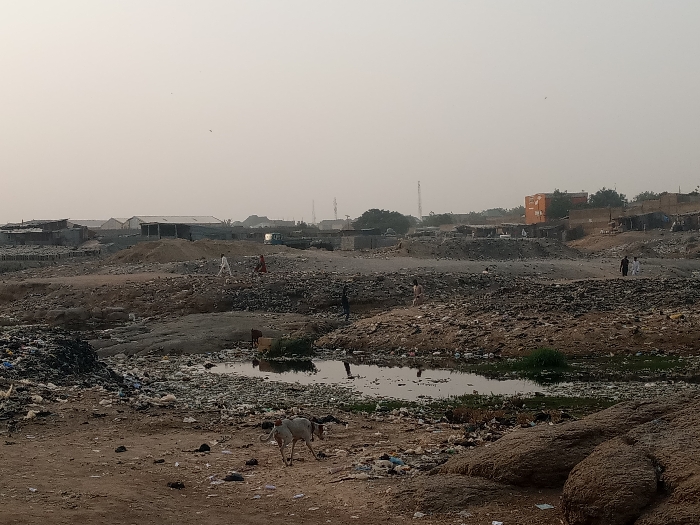 A desolate landscape dominated by trash and debris. Buildings and infrastructure appear in the background under a hazy sky. Several people walk through the trash-strewn terrain. A stagnant pool reflects the muted light, adding to the scene's forlorn atmosphere. A light-colored dog moves across the foreground, contrasting with the overall grim environment. Large rocks are visible in the foreground.
