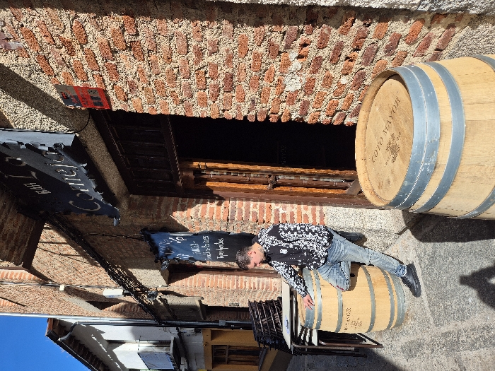 The scene depicts a narrow street in Piedrahíta, Spain, with a young male individual positioned outside a bar named "BAR La Coneja." The bar is housed in a building constructed of reddish-brown brick, with a dark wooden doorway slightly ajar. Above the doorway, a black, irregularly shaped sign displays the bar's name. To the right of the door, on the brick wall, a red and white security system sticker is visible. To the left of the doorway, a dark rectangular chalkboard sign lists items, including "tapas." The male subject, wearing a black and white patterned hooded jacket, light blue jeans, and dark shoes, is leaning against the brick wall to the immediate left of the bar's entrance. His right foot rests on the lower portion of a large wooden barrel positioned on the cobblestone pavement. His right hand is placed on the top surface of this same barrel, which bears partially visible text including "RIBERA DEL DUERO." A second, identical wooden barrel stands closer to the foreground, to the right, displaying "COTO MAYOR" on its top. To the left of the subject and the first barrel, a stack of metal outdoor chairs and a folded table are visible. Strong sunlight casts clear shadows on the ground, including the subject's silhouette. In the background to the left, another building with a lighter facade and a white balcony can be seen.