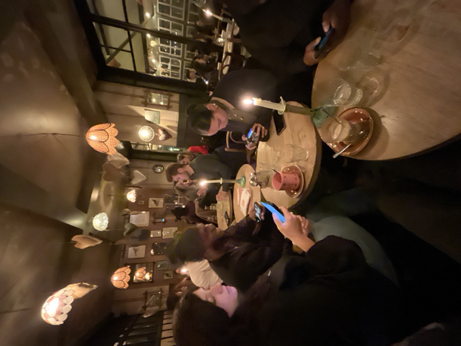 An indoor gathering of people sitting at tables, illuminated by decorative hanging lamps and candles. The tables are round and cluttered with cups, saucers, and glasses. Many individuals are engrossed in their mobile phones. The setting appears to be a dimly lit restaurant or cafe, with walls decorated with various framed items. The atmosphere is casual and relaxed.