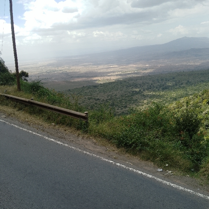 This image captures a panoramic view from a high vantage point in Nkaimurunya ward, Kenya. In the immediate foreground, a dark asphalt road with a solid white shoulder line is visible, bordered by a dirt and sparse grass verge containing minor debris. A rusty, brown metal guardrail runs parallel to the road, positioned on the edge of a steep embankment. Dense green shrubbery and bushes cover this slope, obscuring parts of the guardrail. A dark utility pole extends vertically from the lower left, partially hidden by the guardrail and foliage. The extensive background reveals a vast valley or plain, characterized by a textured landscape of varying green vegetation and lighter, open ground, stretching towards hazy, distant hills or mountains on the horizon. The sky above is partly cloudy, featuring a mix of grey and white cloud formations. No individuals, vehicles, or animals are present in the scene.