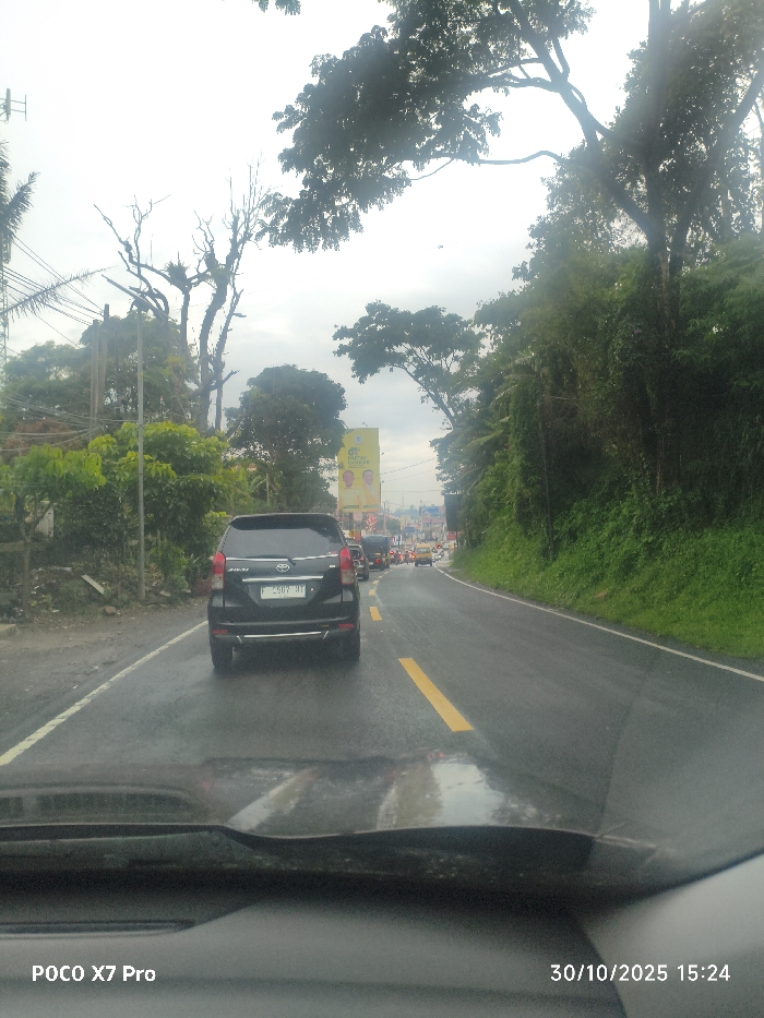 The image depicts a roadside scene in Cipanas, Indonesia, viewed from inside a vehicle during an overcast day. The wet asphalt road, marked with a dashed yellow center line, extends into the distance, indicating recent rain. A black Toyota Avanza with license plate F 4567 HY is positioned directly in front of the camera vehicle, facing away, and appears to be stationary or moving slowly. Beyond the Toyota, a queue of multiple vehicles, including cars and a yellow microbus, suggests traffic congestion. On the left side of the road, dense green foliage and utility poles with overhead wires are visible. Further down the road on the left, a large billboard partially obscured by trees displays two male figures and text, with "SUKASARI HEBAT" partially discernible. On the right side of the road, a steep embankment is covered in lush green vegetation and large trees. The sky is uniformly grey and overcast. No individuals are clearly visible outside the vehicles. The perspective includes the top of a dashboard and a portion of the windshield in the foreground. The image timestamp is 30/10/2025 15:24, captured by a POCO X7 Pro.
