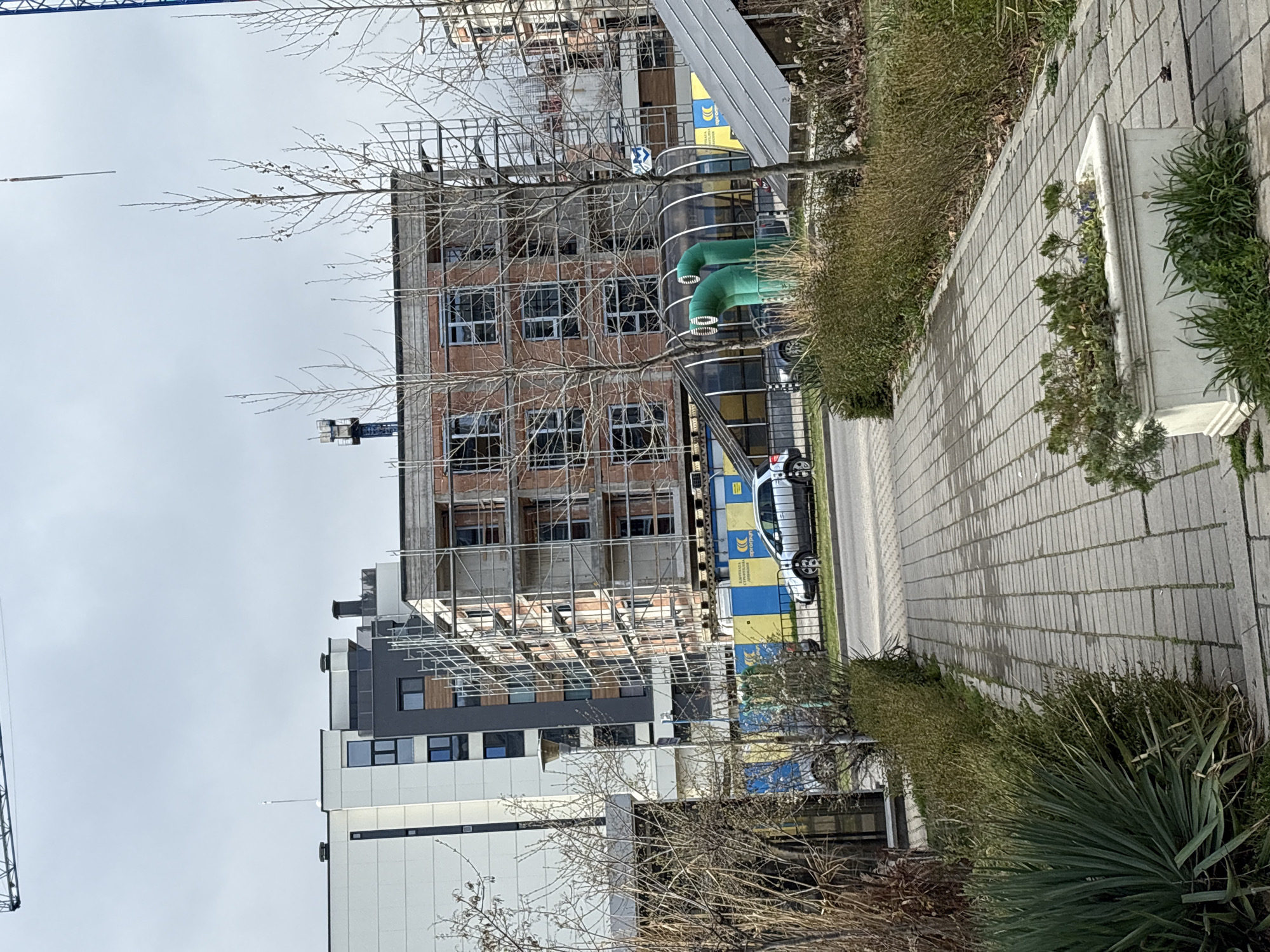 building under construction in Sofia, Bulgaria. The building is multi-story, and is partially covered with scaffolding. There is a modern, white and grey building next to it. A construction crane is visible. A sidewalk runs along the side of the building, and it is lined with hedges, plants and concrete flower planters. A car is parked on the street beside the sidewalk. There are large, green, curved pipes near the building under construction. The sky is overcast.