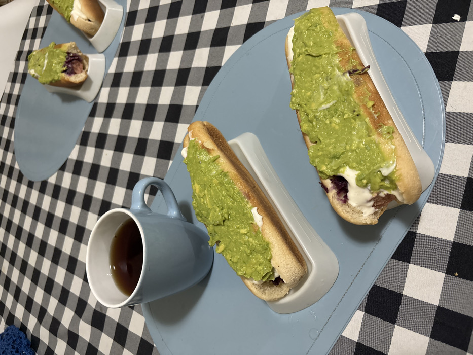 Two plates, each with a hotdog topped with avocado and what appears to be cream, are placed on a checkered surface. A mug of dark liquid sits next to one of the plates. The plates are light blue, and the hotdogs rest in white, elongated serving dishes. A third plate with a similar but smaller hotdog is visible in the background, along with a crocheted item.