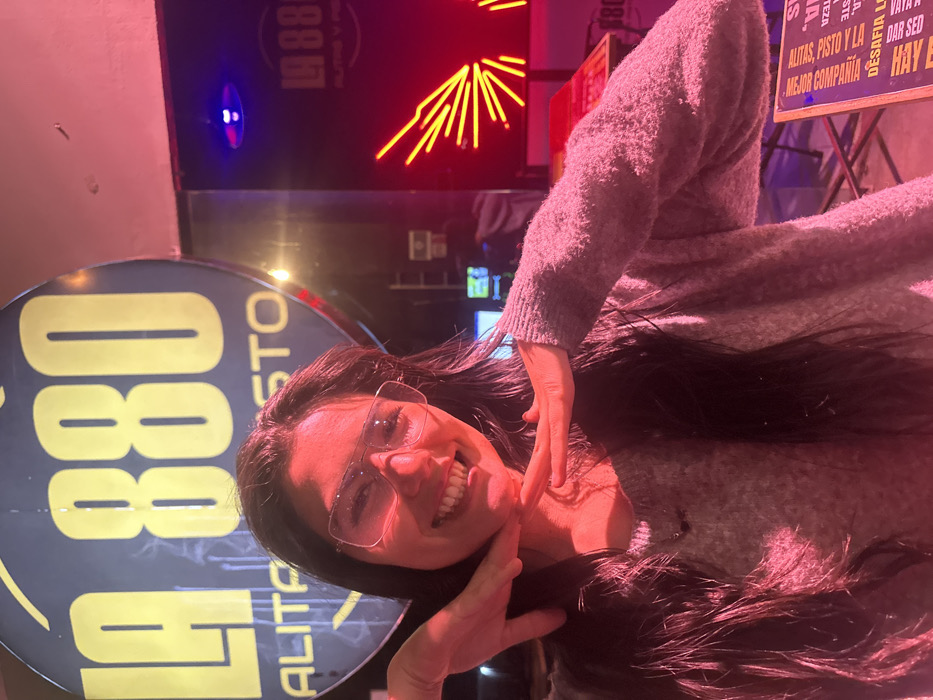 A woman with long, dark hair, wearing glasses and a gray sweater, smiles and poses with her hands near her face. The backdrop includes signage for "LA 880 ALITA STO" with "1988" below it, and text in Spanish referencing "ALITAS, PISTO Y LA MEJOR COMPANIA". A neon light fixture and additional signage are also visible in the background, all illuminated with a strong pink or red light.